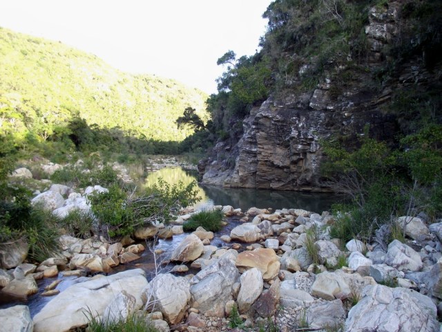 Travelling along the N2 towards the Garden Route from Port Elizabeth, most people cross over the Van Stadens River Bridge in seconds as they hurry along. I often wonder how many of those have ever taken the time to take a leisurely drive along the pass on the old road. At the bottom of the pass one can pull over and enjoy the view, both up towards the bridge as well as down the gorge. It felt like such a peaceful spot with the river flowing in between the boulders that it felt a pity when we had to leave again.