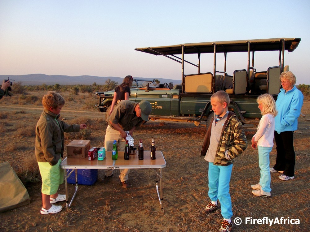 With the sun heading towards the horizon at a leisurely pace, Romeo drove us to an open area where approaching animals could be seen from a distance for our sun downers. With cold drinks for the kids, beers for the adults and snacks all around, the African sun set over the horizon in brilliant oranges and yellows. My favorite time of the day and my favorite part of the game drive. A time to really take in the surroundings, enjoy the smell of the veld and watch the end of another day. With dusk turning to darkness, Romeo turned the nose of the land cruiser back towards the lodge and we all knew that dinner was calling.