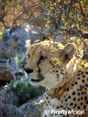 Once again we weren’t disappointed with Kalahari and Matt sleeping off their meal in the morning sun with Matt only getting up when we blocked his sun. Like before Romeo maneuvered the vehicle so that we could get some striking photographs before heading on in search of another big cat. This one being the world’s fastest land mammal. The cheetah. Kuzuko has two male cheetahs, Batman and Robin, both who wear radio collars for when guests go on cheetah walks and they need to be found quickly. We didn’t make use of the signal to find them, preferring to do it the hard way. Ironically enough they seem to have found us rather then the other way around as somebody looked back and saw them casually strolling down the track after the vehicle.