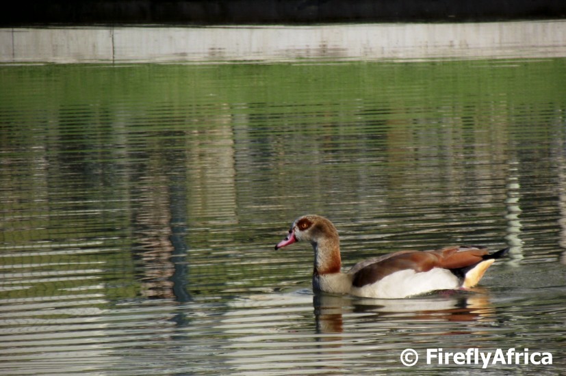 Have you even noticed that you will always find Egyptian Geese where ever there is water.  Lakes, dams, rivers, ponds and even on the off chance a backyard pool.  When the Boardwalk development opened in Port Elizabeth some years ago it wasn’t long before a pair moved in and they have been there ever since, hatching their chicks every year.  The same has happened at the new Kings Beach development with a pair moving in very soon after completion.  I snapped one of them the other day while checking up on a geocache in the area.