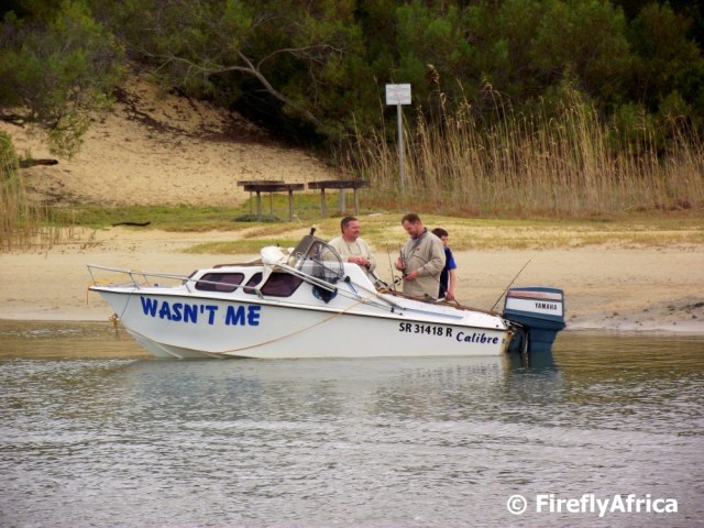 A couple of guys fishing on the Sundays River.  Cool name for the boat specially if its used to escape the wives for a day of beers and fishing.