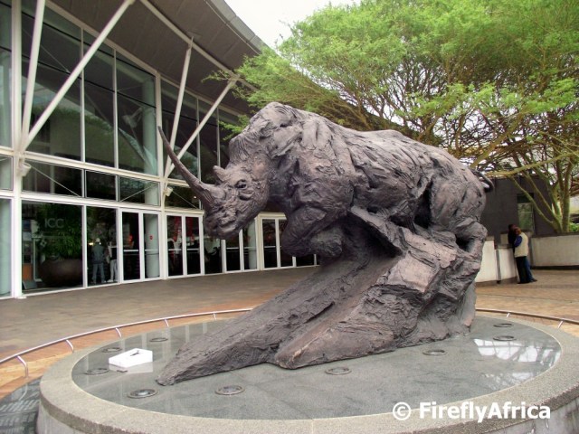 The idea for the bronze rhino outside the Durban ICC was born during the planning of the Fifth World Parks Congress which took place in the city in 2003. The rhino is installed on a plinth with the following inscription: “The White Rhinoceros” This dramatic and powerful animal is a symbol of the contribution made to SOUTH AFRICA by BIODIVERSITY CONSERVATION the endeavours of which have led to the RESTORATION OF OUR WILDLIFE HERITAGE and A MASSIVE CONTRIBUTION TO THE ECONOMIC GROWTH OF SOUTH AFRICA. It also celebrates the holding of the Fifth World Parks Congress at the Durban ICC, September 2003. Commissioned by THE CONSERVATION TRUST”.