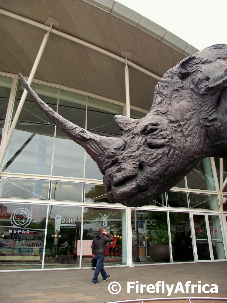 The idea for the bronze rhino outside the Durban ICC was born during the planning of the Fifth World Parks Congress which took place in the city in 2003. The rhino is installed on a plinth with the following inscription: “The White Rhinoceros” This dramatic and powerful animal is a symbol of the contribution made to SOUTH AFRICA by BIODIVERSITY CONSERVATION the endeavours of which have led to the RESTORATION OF OUR WILDLIFE HERITAGE and A MASSIVE CONTRIBUTION TO THE ECONOMIC GROWTH OF SOUTH AFRICA. It also celebrates the holding of the Fifth World Parks Congress at the Durban ICC, September 2003. Commissioned by THE CONSERVATION TRUST”.