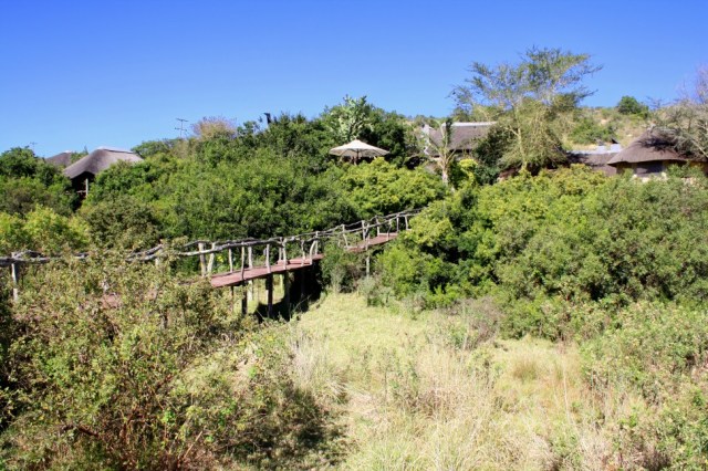 A different view of the walkway, this time looking towards the pool deck from the lodge. The waterhole is on the left of the deck. Do you now get why I like this so much?