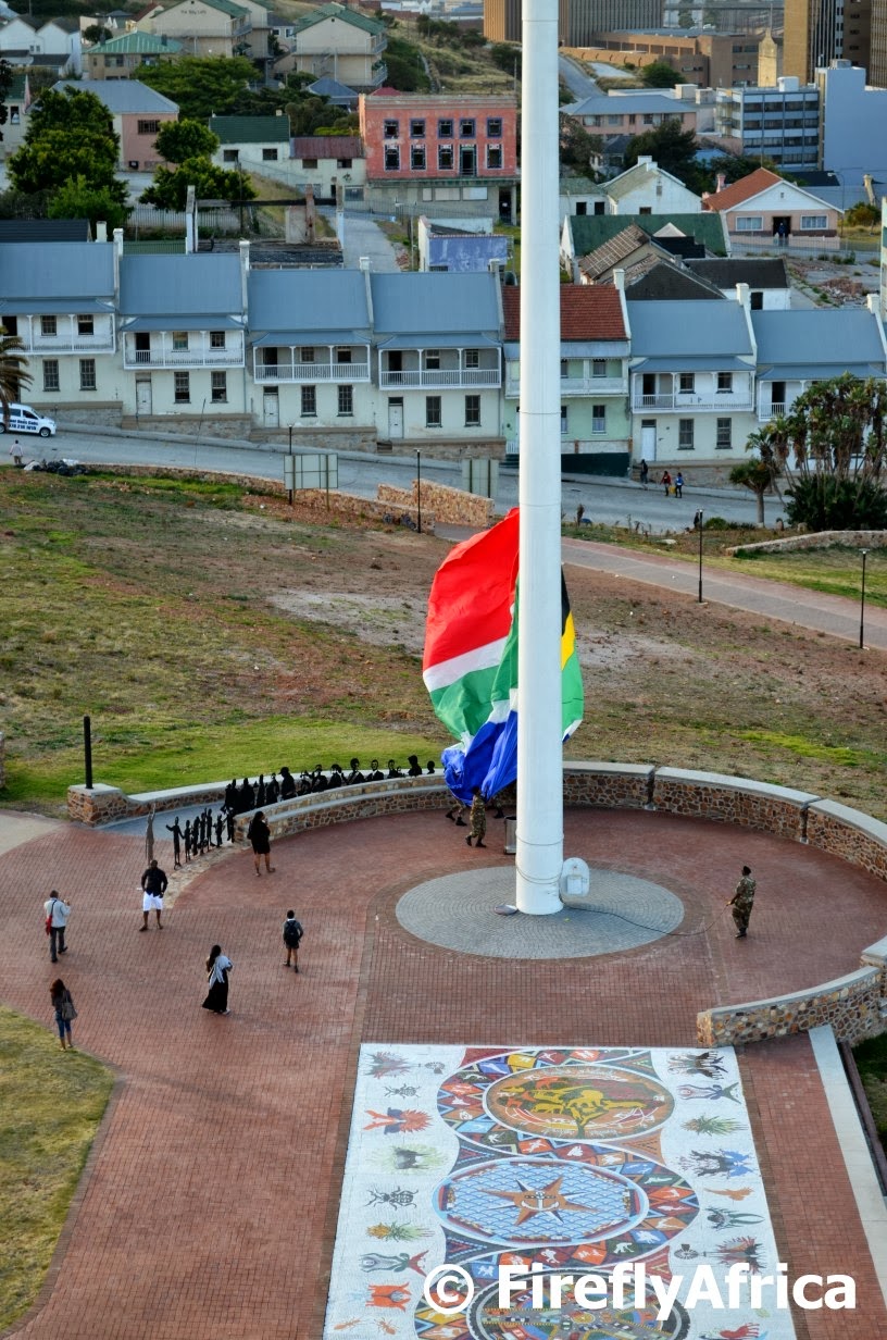 The Great Flag on the Donkin Reserve measures about 10 meters x 15 meters yet while its flying 65 meters up on the second tallest flag pole in Africa it doesn’t quite look that size.  That is until it gets taken down in the evening by the Prince Alfred Guard and needs six soldiers to catch, control and return to its container.