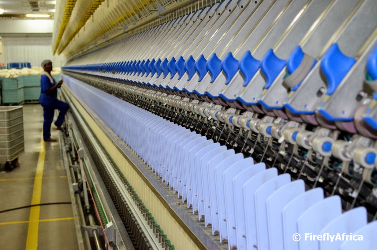 I think everybody should go on the Hinterveld Mohair Mill tour in Uitenhage at some stage. Believe me, its really worth it. Visitors get to see the whole process that mohair goes through from arriving in its raw form right through to where it goes out as yarn or, even better, beautiful mohair blankets. This is one of the machines that spin the yarn from the top, with yarn often being twisted or brushed (raised) for a fluffy appearance during the process.