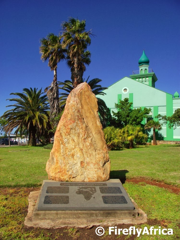 The Pier Street Mosque, or Green Mosque as many know it as, is probably one of the most recognisable places of worship in Port Elizabeth. Not many would know though that the open space next to it is called Dias Park, named after the first European to round the Cape and discover Algoa Bay. Bartholomeus Dias entered the Bay in 1488 and planted a stone cross on St Croix Island. Today this rock, which has absolutely no link to Dias what so ever other than his name, is situated in the middle of the park with a plaque containing information on his journey..