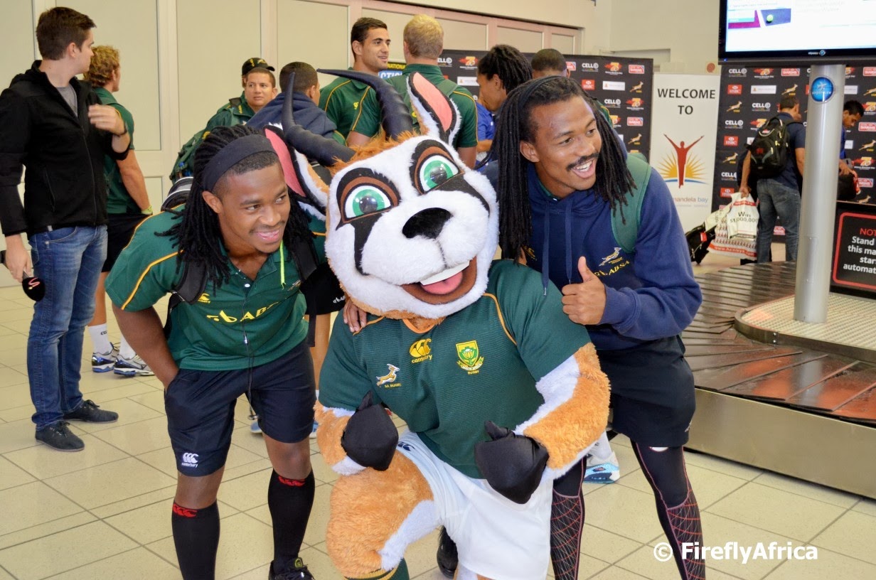 This weekend (the whole week actually) is a big weekend in the Bay. Its the weekend when the South African leg of the International Rugby Boards 7’s world series takes place at the Nelson Mandela Bay Stadium. Its two days of action packed rugby on the field and lots of party action off it. All 16 teams taking part came in on two flights last night and I was lucky enough to make the special list to get me past the supporters and into the arrivals area. I love my job. Anyhow, the South African Blitzbokke were on the first flight and the main reason everybody was there, getting the biggest reception when the teams walked out to their buses. Here Springbok mascot Bokkie poses for a couple of pictures with Blitbokke stars Branco du Preez and Cecil Afrika.
