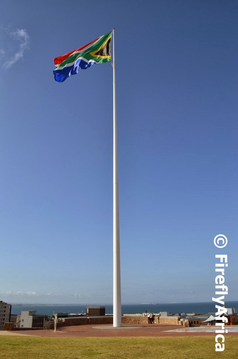 Over the last ten days since the death of Nelson Mandela, all South African flags, including the Great Flag on the Donkin Reserve, have been flying at half mast. Today (Sunday 15 Dec) Madiba was buried in his home town of Qunu in the Eastern Cape which means all flags will be fully hoisted from tomorrow on again. The Great Flag forms part of Route 67 and flies on top of the tallest flag pole in South Africa. At 65 meters tall the pole is the second tallest in Africa, shorter only than a flag pole in Angola. The flag flying at its top is the biggest South African flag in the world, measuring 10 meters by 15 meters, nearly the size of a tennis court. Looking at it like this it doesn’t look that big until you realise that there are two people standing close to the pole’s base