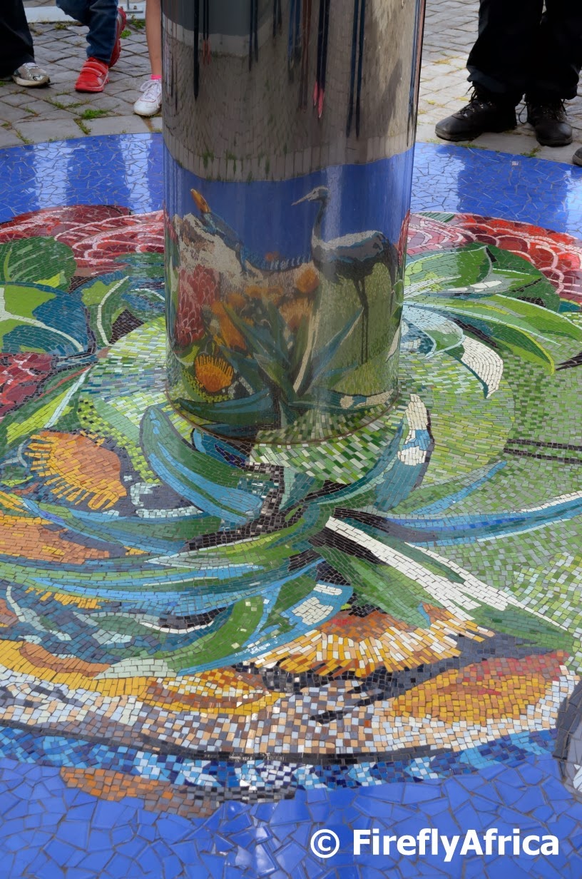The Harmony of Nature art piece in front of the Athenaeum is probably one of the most interesting art pieces on Route 67.  It uses an old optical technique used by master like Leonardo Da Vinci and Michelangelo where a mosaic picture which looks distorted reflect perfectly in the metal pole in the middle of the picture.  The image contains natural symbols of the Eastern Cape like the Blue Crane and Protea.