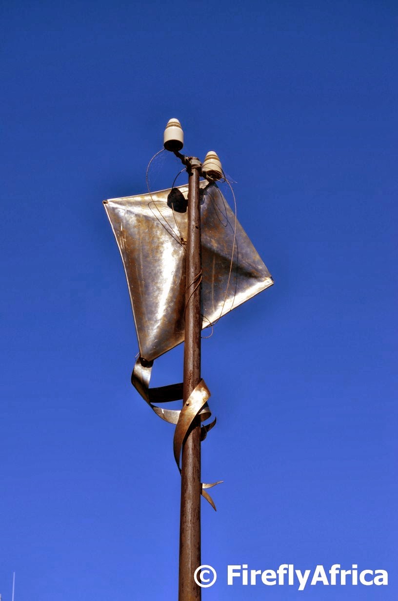 In the play Sam makes Hally (Fugard) a kite from junk and teaches him to fly it as well. Sam also teaches Hally that flying a kite means holding the head high and it was very special advice for Hally who was having a bad day. From that day a special bond was created between Sam and Hally. Later on the in the play Hally, in a moment of anger, mistreats Sam and Willie – another worker at the tea room. But I’m not going to explain the whole play here. All this does work up to the next point I want to make. Outside the old tearoom artist Mark Wilby has created a memorial to Fugard referring to the play. Inspired by the kite Sam crafted for Hally, the memorial is a simple stainless steel kite on top of a lamp pole. I bet not a lot of Port Elizabeth folk knows about the kite.