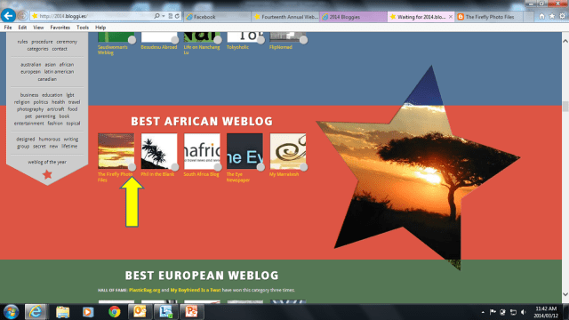 Imagine my excitement when I was told the other day that The Firefly Photo Files has been selected as one of five finalists as Best African Weblog in the fourteenth annual Weblog (Bloggies) Awards. This is where I would like to ask for some help from you. Public voting plays a major role in how the winner gets chosen and I need all of you as well as your spouses / partners / moms / dads / kids / uncles / aunts / grannies / friends / co-workers and anybody following you on social media to please go and vote. “How do you do it?” you ask. Well, here are 7 easy steps.