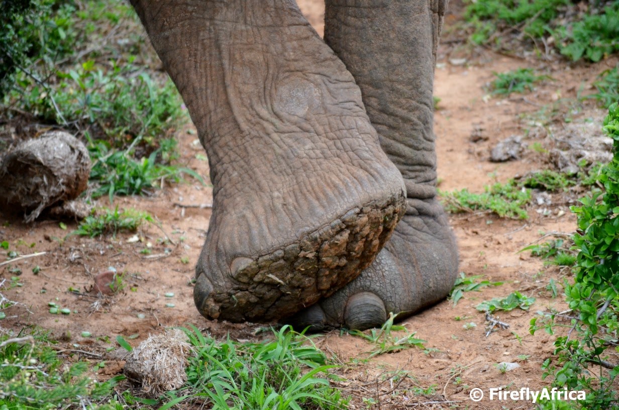 Elephants have circular feet with soft tissues or “cushion pads” beneath the manus and pes. This helps to distribute the weight of the animal. They appear to have an extra “toe” similar in placement to a giant panda’s extra “thumb”, that also helps with weight distribution. Five toenails can be found on both the front and hind feet.