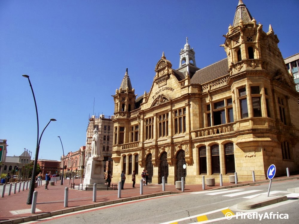 One of Port Elizabeth’s best known historic landmarks is the Public Library with the statue of Queen Victoria in front of it. The statue of Queen Vic was unveiled by major of Port Elizabeth, J.C. Kemsley, on 30 September 1903. It was carved from Sicilian marble by Edward Roscoe Mullins of London to commemorate the Queen’s Diamond Jubilee which took place in 1897 and was paid for my public subscription. The first site preferred was in front of the City Hall but the present site was chosen after it was suggested by the Guild of Loyal Women. Standing in front of the library, the statue looked down Jetty Street to the main entrance to town.