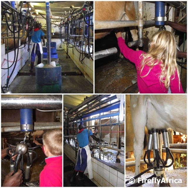 The Tsitsikamma Sunrise Caravan Park where we stayed had on their website that you can go and see how the cows get milked across the road at the farm stall.  Little did we know that its not just one or two cows but close to 200 of them.  On our first morning there we went to find out what time they milk and were told 4pm to 6pm.  This meant that the KidZ were watch watching all day long and made sure we were back in time from the beach to go and see the cows.  Not just was it the KidZ first time in a commercial dairy but also my own.  I was snapping pictures and asking questions while trying to stay out the workers’ way best I could to allow them to continue with their work.  After a while one of the workers called the KidZ over and showed them how the machines worked.  They even got to try their own hands at milking and Drama Princess got to put the milking machine on one of the cows. WOW! And there I thought we may just get to have a peek before being asked to leave.  Kudos to these workers to take time out in between doing their job to show these city folk what they do even if they don’t have to.