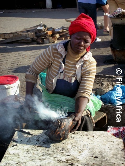 Smileys is a delicacy in the townships and visiting Njoli Square in Zwide you get to see vendors prepare this sheep head meal for the lunch time and after work rush coming past.