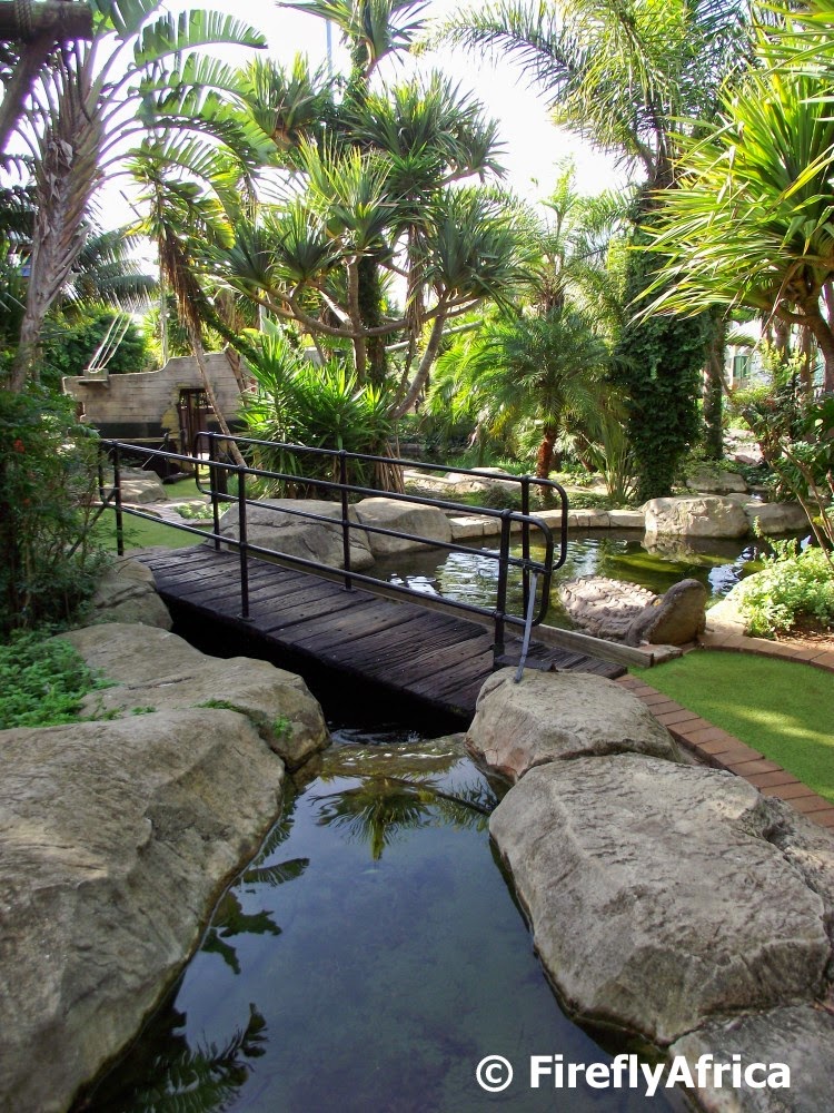 One of the things I enjoyed most about a visit to Sun City in North West Province a couple of years ago was the beautiful gardens that surrounded the hotels.  The Boardwalk doesn’t quite have the space to lay out such elaborate gardens and waterways, but they do have a stunning little tropical corner around the putt-putt (mini golf for those who don’t know what putt-putt is) course.  Look carefully in the picture and you’ll see a croc waiting for the next golfer hitting a ball towards the water *wink*