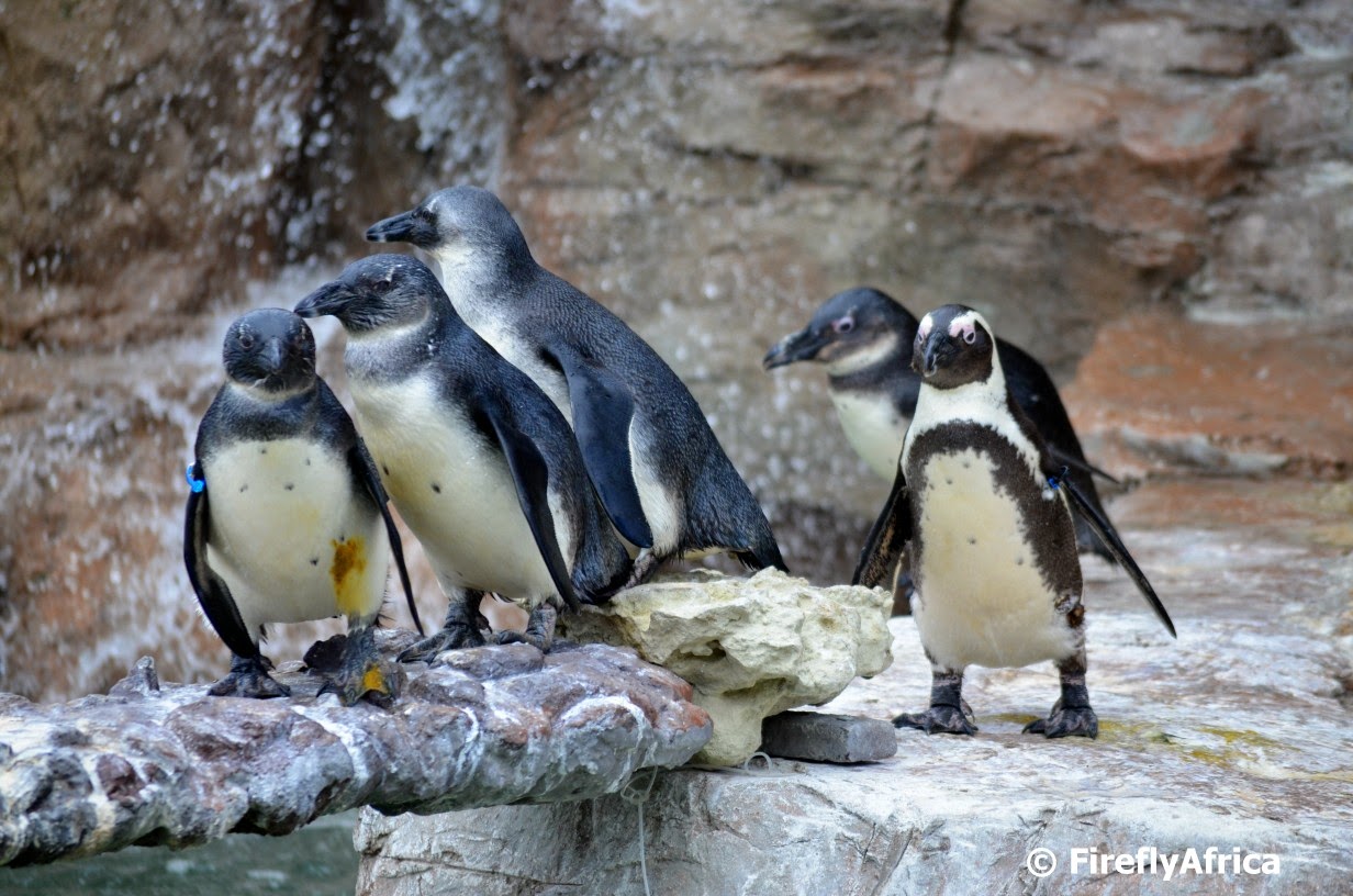 A couple of young penguins being ushered along the “diving board” by an adult at the South African Marine Rehabilitation and Education Centre (SAMREC) in Cape Recife in Port Elizabeth.