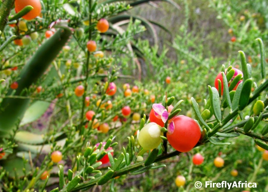 Have you ever picked up how some people can go through life without noticing the little things?  Often this is the same story when you take a group of people on a hiking trail.  Some people would just do the walk to be out in the fresh air, some would enjoy beautiful views and scenic attractions and usually a small percentage would notice the details.  A succulent with a tiny little flower, a buck spoor in the soft sand, a butterfly fluttering by or wild berries on a bush like the ones in the picture.  These berries presented themselves on a walk along the Maitland Trail in Port Elizabeth.  Unfortunately I never took note of what the guide said they were.  I was too busy trying to get a good photo.