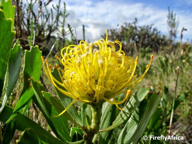 The Pincushion Protea (Leucospermum) is a genus of about 50 species of flowering plants in the family Proteaceae – part of the Cape Floral Kingdom also known as Fynbos. They occupy a variety of habitats, including scrub, forest, and mountain slopes. In the case of this one, I photographed it in the Van Stadens Wildflower Reserve. They are evergreen shrubs (rarely small trees) with tough and leathery leaves. The flowers are produced in dense inflorescences, which have large numbers of prominent styles, which inspires the name.