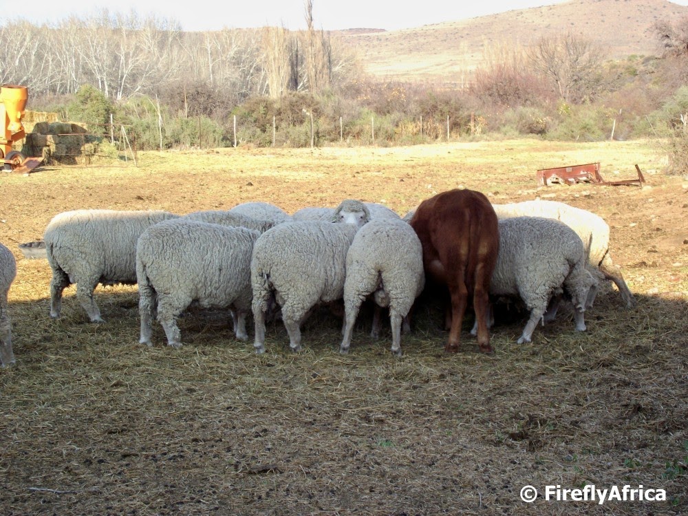 I recently spent a night at the highly recommended Ganora Guest Farm near Nieu-Bethesda. Early morning before breakfast I went for a walk around the farm and down to the river. On my way back I found this interesting scene of a calf having breakfast with the sheep. A case of mistaken identity?