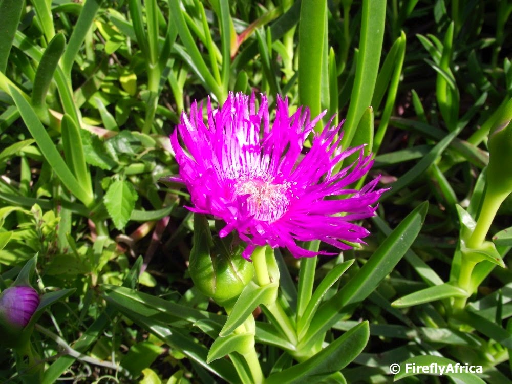 Carpobrotus deliciosus (sour fig, perdevy, ghaukum, ghounavy ) is a fairly well know sight in this area. They have purple, pink or white flowers, almost straight, green leaves and sweet fruits that make excellent sour fig preserve. They grows on sand dunes and in rocky grassland along the southern and eastern coast of South Africa from Riversdale in the Western Cape through the Eastern Cape to KwaZulu-Natal. This one was photographed in The Island Nature Reserve west of Port Elizabeth.