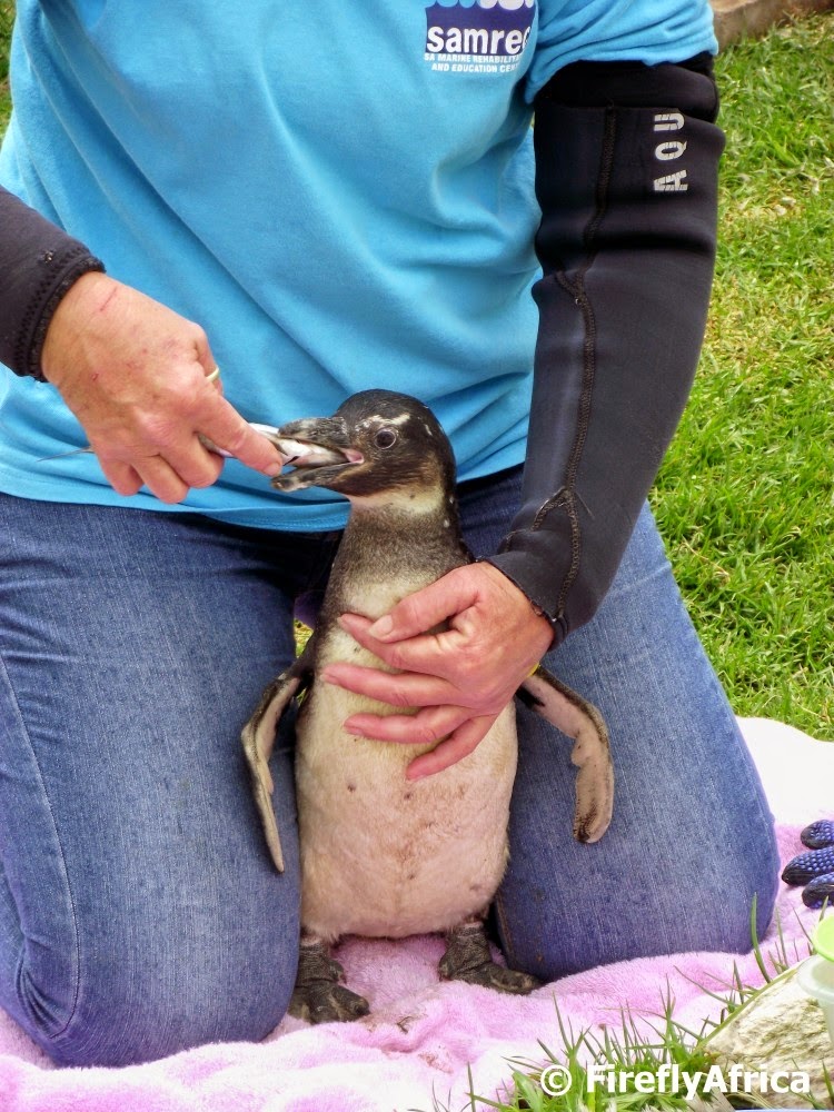 Early morning and late afternoon visitors to SAMREC in Cape Recife will be lucky enough to see how the penguins are fed as part of their tour. The guide explained the whole feeding process to us. As it turns out its not just a case of stuffing a couple of fish down their throats. Every fish that is given to a penguin is recorded and placed on their personal files. Some of the little guys have to still get medication as well with tablets hidden inside certain fish so the records are checked and each one only gets what he is supposed to get. After eating its time to head over to the pool for a morning swim after spending the night in their sleeping enclosure.