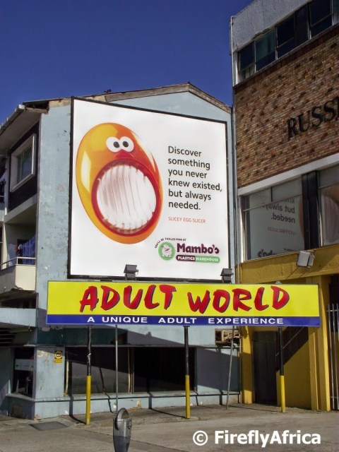 Most people know where Adult World is on Russell Road. Not because they’ve been there but because there is a big sign outside. Just above it is a billboard that has been taken up by Mambo’s Plastic Warehouse. The two together though makes for a very odd combination. What is seen can never been unseen……