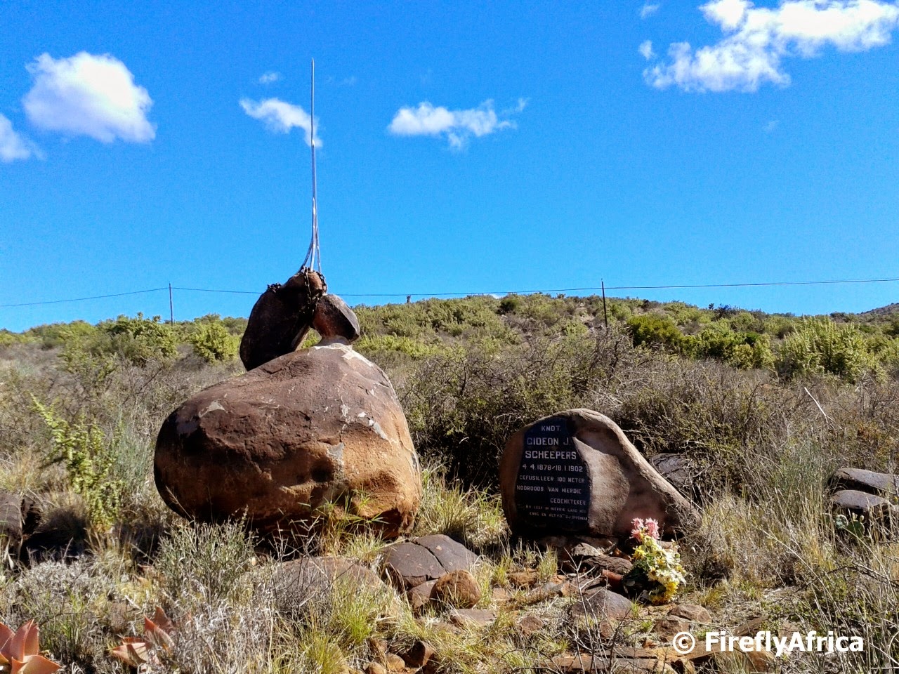 The Gideon Scheepers Monument remembers  Commandant Gideon Scheepers who was a Boer scout and commanding officer during the Anglo-Boer War.  Scheepers and those under his command wrecked trains and burned the farms of those unsympathetic to the Boer cause.  He was captured in October 1901 by the British and found guilty by a British military court on charges of murder and arson.  He was buried at the place of his execution by a firing squad in the veld near Graaff-Reinet.  He was only 23 years old.  That same night his body was apparently exhumed by British troops and reburied at an unknown spot.  Efforts to trace his grave and approaches to the British authorities to reveal its location was unsuccessful.