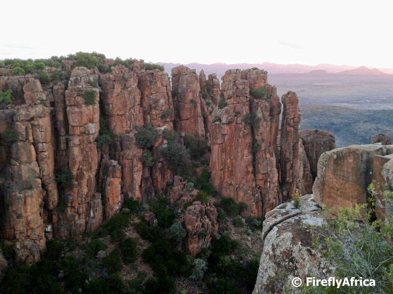 A short drive later and a quick walk up the hill brings you to the view site from where the Valley of Desolation can be seen. I’m no geologist and (probably) neither are you so I’m just going to give an basic explanation of what it is. The Valley of Desolation consist of sheer cliffs and precariously balanced columns of Dolerite rising 120 metres from the valley floor. All of this against the timeless backdrop of the vast plains of the Camdeboo. The formation is the product of volcanic and erosive forces of nature taking place over 100 million years. Again I was there too late to get the full sunshine on the columns…