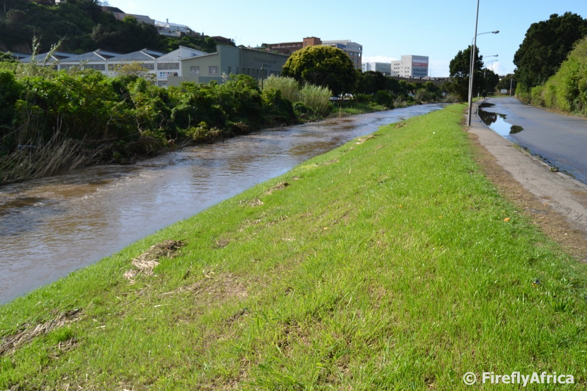 We’ve had a fair amount of rain over the last couple of months… Ok, so maybe a bit more than a fair amount of rain. So much in fact that my backyard has become a swamp with water oozing up between my toes if I walk there barefoot. Last Thursday night and Friday morning it came down in buckets again with me spending part of the morning standing in that rain on the Donkin Reserve as part of an Amazing Race I organized for Skal. After the Skal lunch at Colonial Kitchen I headed back to the office and snapped this pic of the lower Baakens River flowing nice and full.