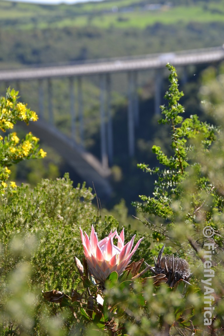 Today is Heritage Day in South Africa and all South Africans celebrate the day differently. Some like to dress up in their traditional clothing while others come together for a braai. Political parties have gatherings, clubs use the day to organise events and some people just stay home and do a few chores or watch tv all day long. I celebrated Heritage Day with my fellow Geocachers at the Van Stadens Wildflower Reserve taking part in the second annual Geocaching Amazing Icon Race. The event took us all around the whole reserve before we had a braai for lunch. It’s Braai Day as well after all. Afterwards I took a drive around the reserve again with my camera as the proteas and many other flowers are all decked out in the Spring best. One of the pictures I snapped was this one of a King Protea with the Van Stadens Bridge in the background.