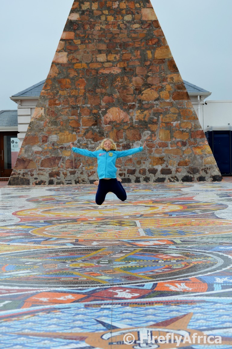 The schools were closed on Friday and I had to take Drama Princess to work with me for the day. Somewhere during the morning we popped up to the Donkin Reserve to drop of maps and brochurs at the visitor information center there and we went for a quick walk around some of the artwork forming part of Route 67. Obviously the camera went along and Drama Princess decided that a plain straightforward picture of her posing on the mosaic next to the pyramid wouldn’t be enough.