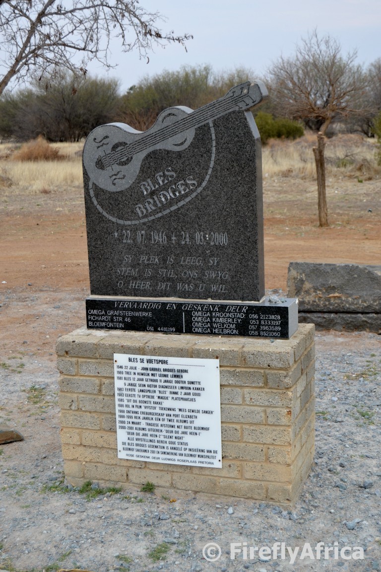 The second unusual monument I got to visit on the trip was the Bles Bridges Monument outside Bloemhof in North West Province. Bles Bridges was a much beloved and very popular Afrikaans singer who died in 2000 in a car accident on this spot just outside Bloemhof. The local business chamber decided to put up a monument to remember him by and there you have it, a monument that looks like a grave stone with a guitar on it.