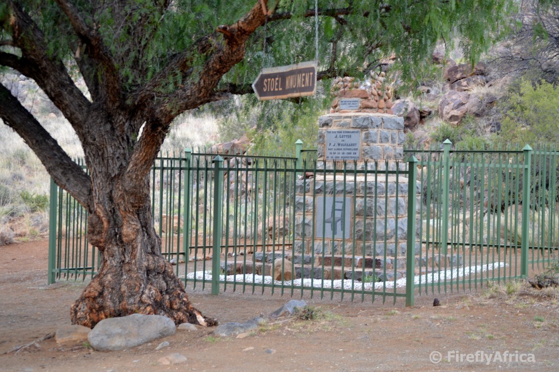 The first one was a monument just outside of Middelburg in the Eastern Cape. The stone monument has a picture of a chair on it and the sign says “Stoel Monument” (Chair Monument). So what is the story behind the Stoel Monument? There’s a long and a short so I will keep to the short. During the Anglo Boer War Commandant J. C. Lotter was well known for his daring hit and run tactics employed against the British forces. Lotter and most of his commando were caught near Graaff-Reinet. Lotter stood accused of “murder, marauding and disgraceful conduct of a cruel nature” and was charged with human rights violations and war crimes. He was found guilty and sent to Middleburg where he was sentenced to death. At the spot where the monument stands is where he was tied to a chair and shot. Get it? Tied to a chair and shot = chair monument to remember him.