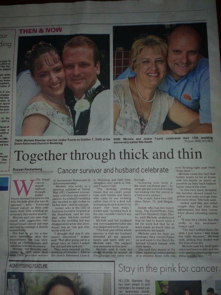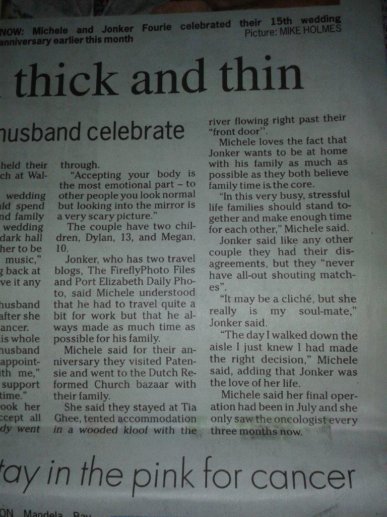 The Damselfly and I had our 15th anniversary two weeks ago and as it goes, posted about it on social media. A few days later I got a call from a reporter at the Herald asking me if they could do an article in the La Femme supplement to include in their regular page celebrating weddings and anniversaries. She emailed us a few questions and organised for a photographer to meet us for the picture. The Damselfly mentioned in her answers something about her breast cancer process and a few more questions came her way. The story fitted in nicely with October being Breast Cancer Awareness Month and got published today along with a relevant article and information. Below as some closeups of the article if you’re interested in reading it.