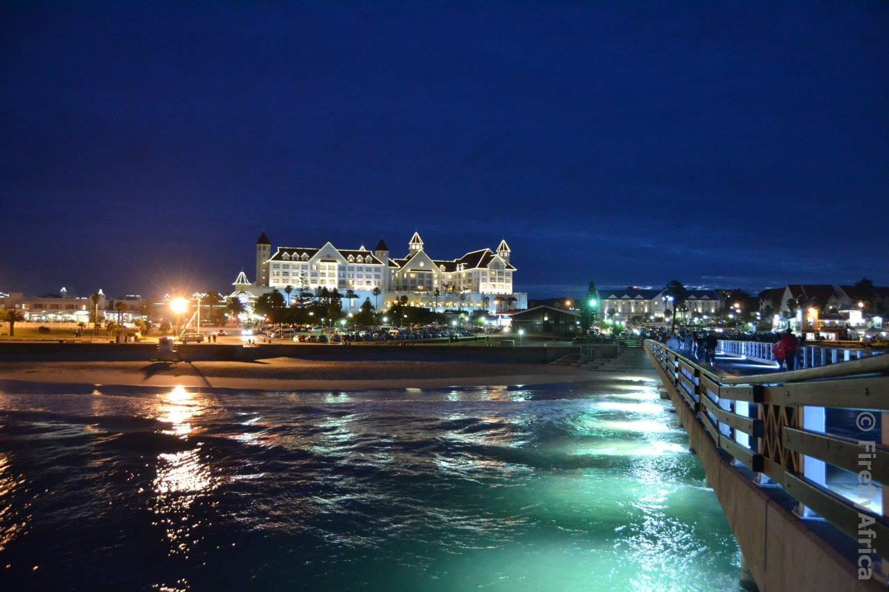 The Boardwalk Hotel, all lit up and looking like a fairytale castle, with Shark Rock Pier, all lit up, Hobie Beach, all lit up, and the beachfront, all lit up. Isn’t the beachfront just beautiful at night?
