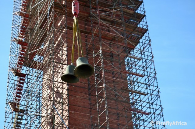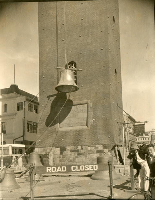 The Campanile, wedged between the Port Elizabeth Railway Station, the PE Harbour and the Settlers Freeway, was built to celebrate the centenary of the landing of the British Settlers in 1820. The tower was built on the landing beach where the Settlers came ashore with the foundation stone being laid in 1921. It was officially opened in 1923, the clock was installed in 1925 (started at noon on 28 April of that year) and the bells hung in 1936. The Then photo shows one of the carillon of 23 bells being hoisted up.