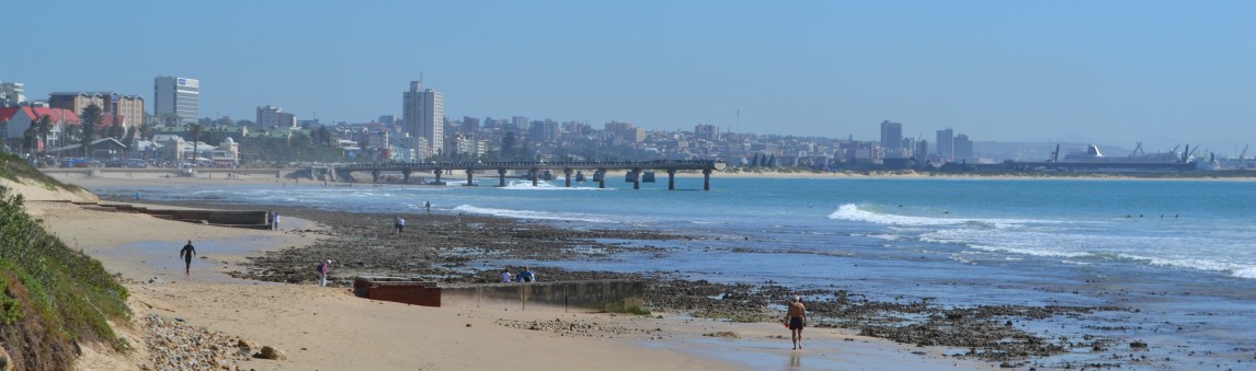 A panorama (of some sorts) of the beachfront looking from Lovers Lane back towards Hobie Beach and Shark Rock Pier with the city in the background.