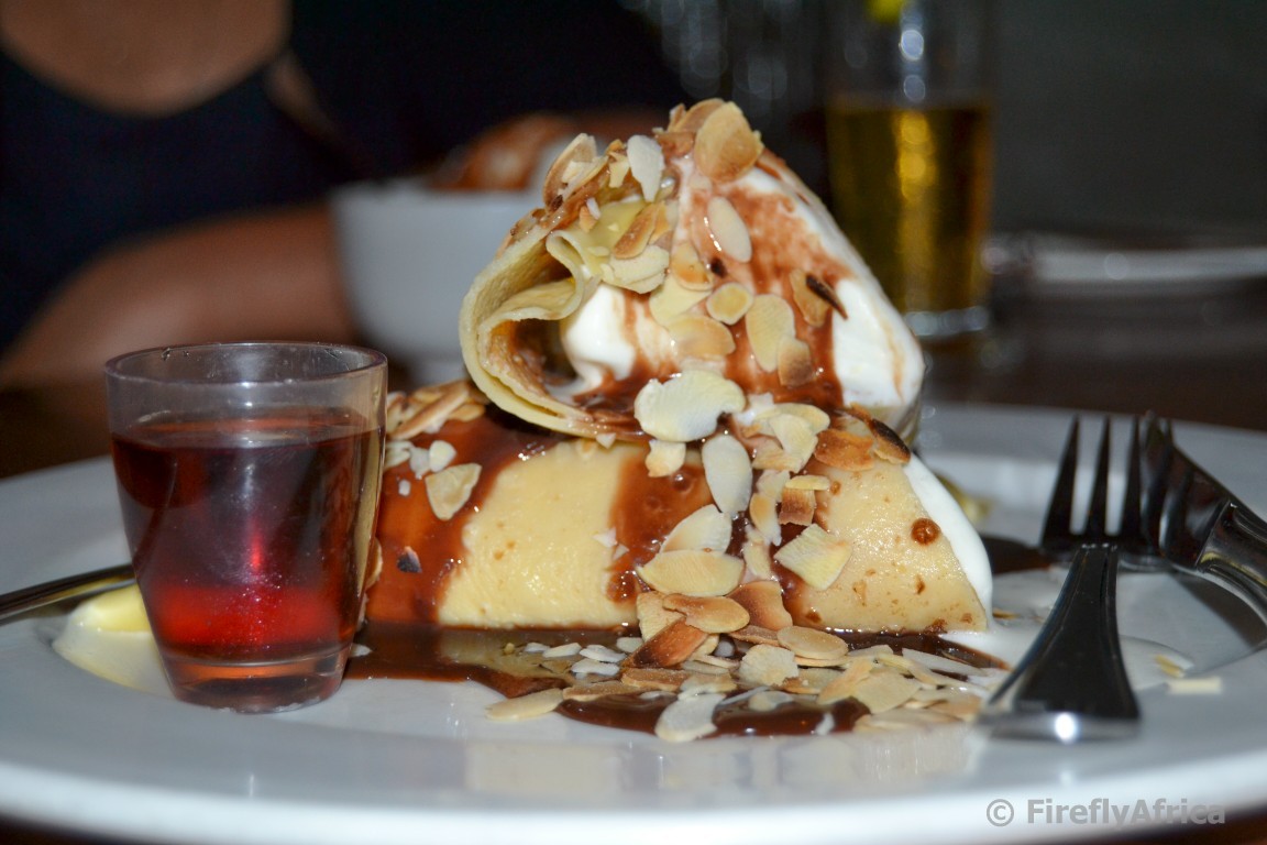 And talking of dessert. Although we weren’t really planning to have dessert after starters and mains, I decided to have a look at the menu anyway. With the Damselfly only having ice cream and chocolate sauce I decided to be a little more adventurous and try something else. I was torn between two options and hadn’t even finished asking the waiter which he would recommend when he said the Kahlua and Ice Cream Crepes. (Ice cream rolled in light crepes, drizzled with hot Bar One sauce topped with roasted almond flakes) I’m sure I could find somewhere to fit that in as well… Out came the plate with two pancakes filled with ice cream and accompanied by a shot of Kalua. My eyes went big but it tasted so yummy that I made sure I found enough space for all of it. Fifth tick goes to the dessert giving them a full house for the evening.