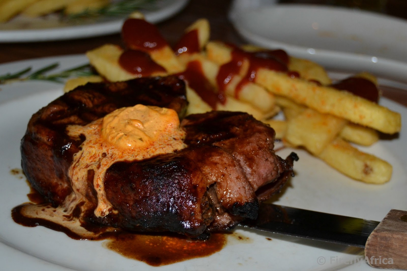 Then it was time to select our steaks. With a great variety it wasn’t easy though and we both probably changed our minds a couple of times while discussing the different options on the menu. The Damselfly eventually settled (although settled probably isn’t the word; more like excitedly chose) on the Camembert and Bacon sirloin steak (Steak with a delectable green peppercorn sauce topped with pan-fried bacon and Camembert cheese. My choice fell on one of their specials for the evening, a Fillet steak stuffed with jalapeno peppers, cheddar and mozzarella wrapped in bacon with a paprika infused butter on top When the steaks came we immediately knew we were in for a treat when we saw that they were flame grilled and cutting into them they were also done to perfection. The Damselfly’s medium rare and mine just over medium (so that a good vet can’t save it anymore). My better half also mentioned that the bacon on her steak definitely wasn’t just catering grade beacon fried in a pan as it had a distinct smoked taste and flavour to it. Both steaks came on very nicely presented plates and were served with chips. Steaks = tick number three and four.