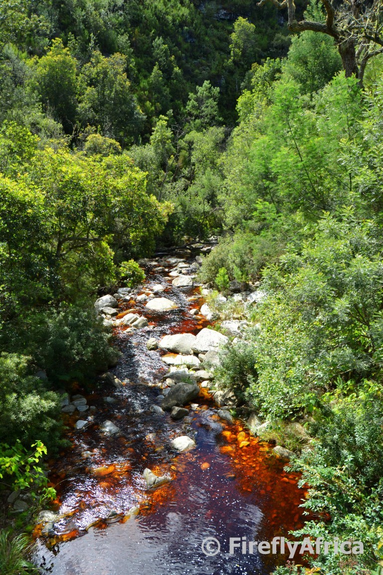 Looking down from the bridge the Keur River could be seen below with the brown coloured water that is to typical of the rivers in the Garden Route region. The brown colour is from tannin the river picks up as it flows through the forests and fynbos of the region. All the leaves and plant material that drops on the ground acts as a teabag of sort as the water flows through it, giving it this colour. The water is still perfectly clean though and used by many straight from the rivers.