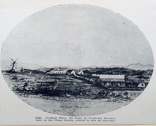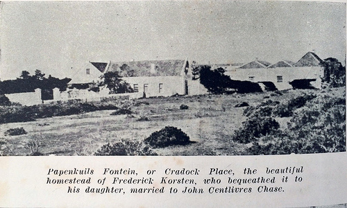 Frederick Korsten passed away on 16 June 1839 at the age of 66 years and bequeathed the farm to his daughter who was married to John Centlivres Chase.  Chase wrote a book called “Old Times and Odd Corners” that documented the history of the estate.  Korsten was buried on the farm and it is said that the cemetery and family mausoleum were at some considerable distance north-west from the house, roughly where Stanford Road and the Papenkuils River run closet to each other today.