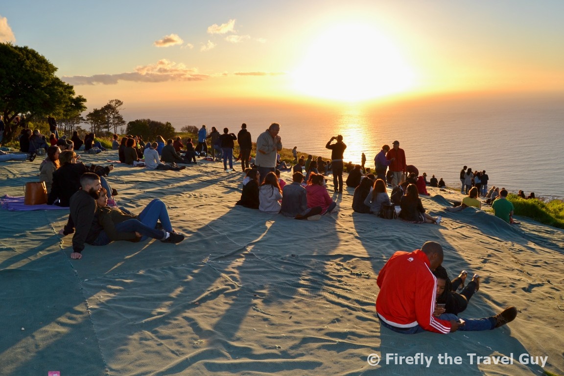 The material covered take off area used by the paragliding outfit based up on Signal Hill makes for the ideal viewing site and as the sun started heading towards the horizon over the Atlantic Ocean, people took their places.