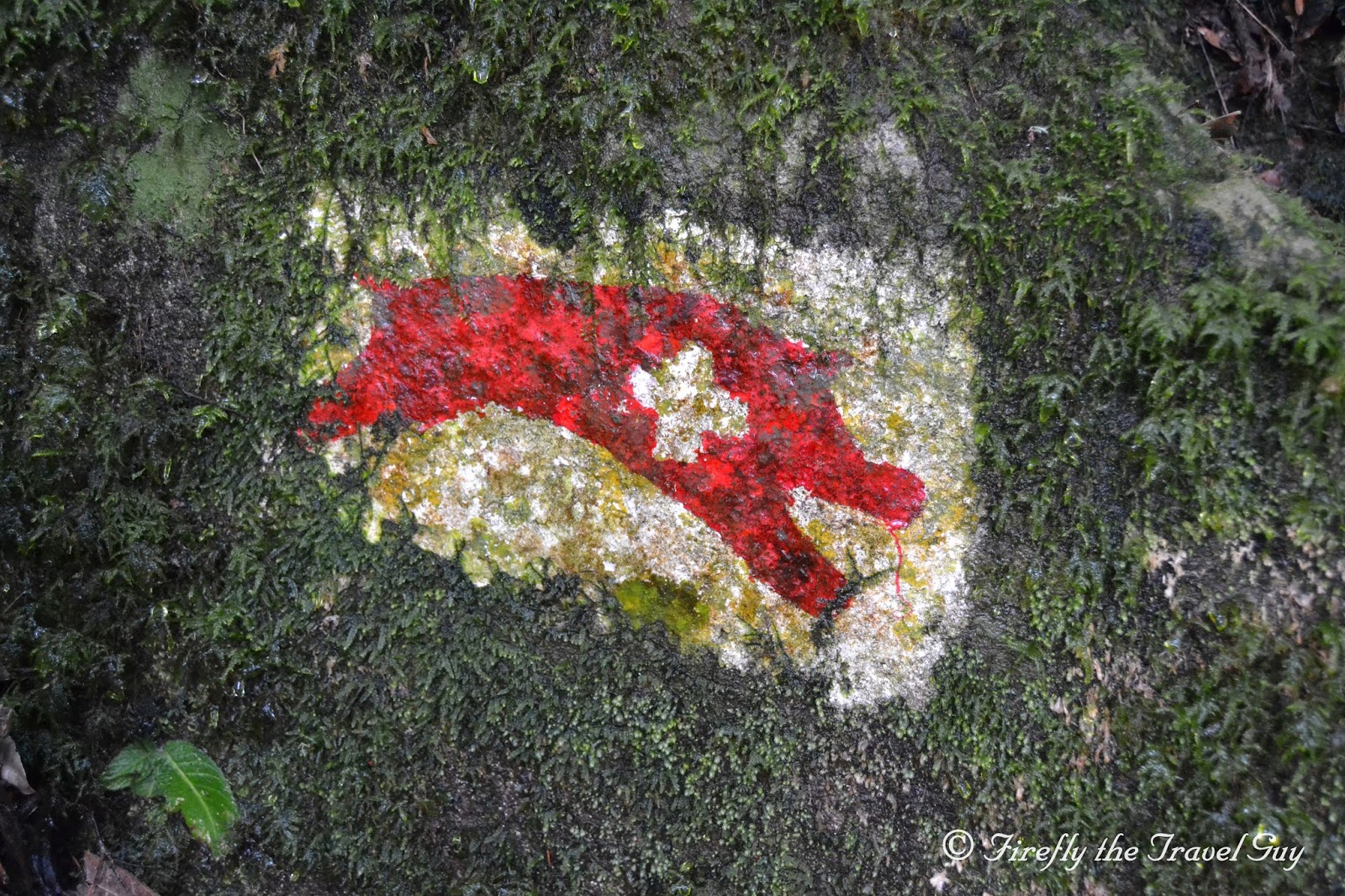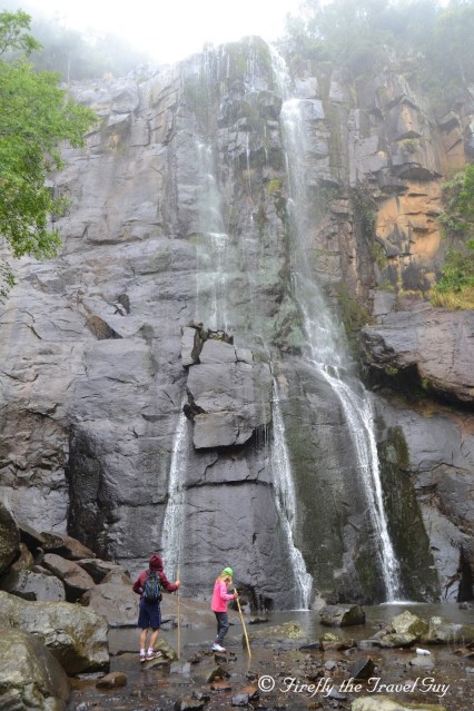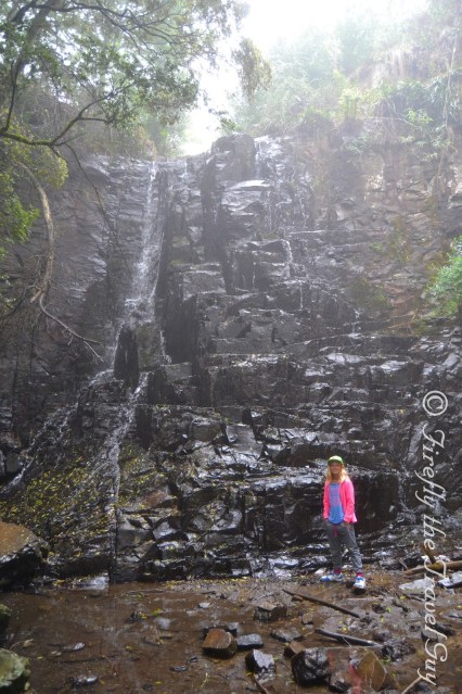 With the raining weather we could easily have opted to rather work our way around the village with all its artist studios and galleries but how can one visit Hogsback and not visit the Madonna and Child Waterfall in the forest. With a warning of a steep and slippery path from the lady in the tourism info office, we took the drive down Wolfridge Road and parked at the start of the trail. From here we followed Hogsback’s famous piggy trail markers down into the forest and even though it was wet and slippery, nobody landed on their b-hinds.