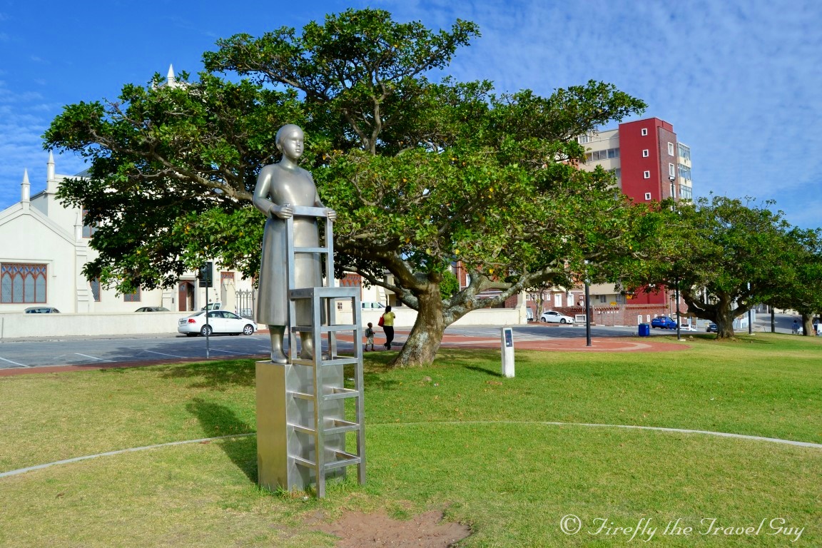 Standing at the top of the Donkin Reserve stands a lone woman on a pedestal holding a chair while looking across the square. She is one of the art pieces which is part of Route 67 and is the work of well known artist Anton Momberg. Do you know what she represents? Take a guess. I will come back tomorrow to place the answer as part of this post below.