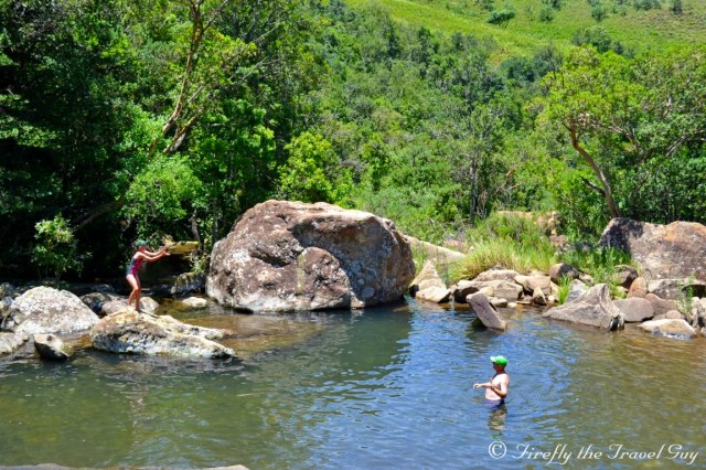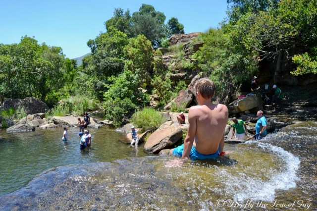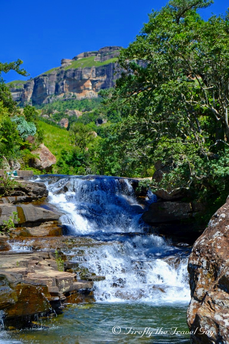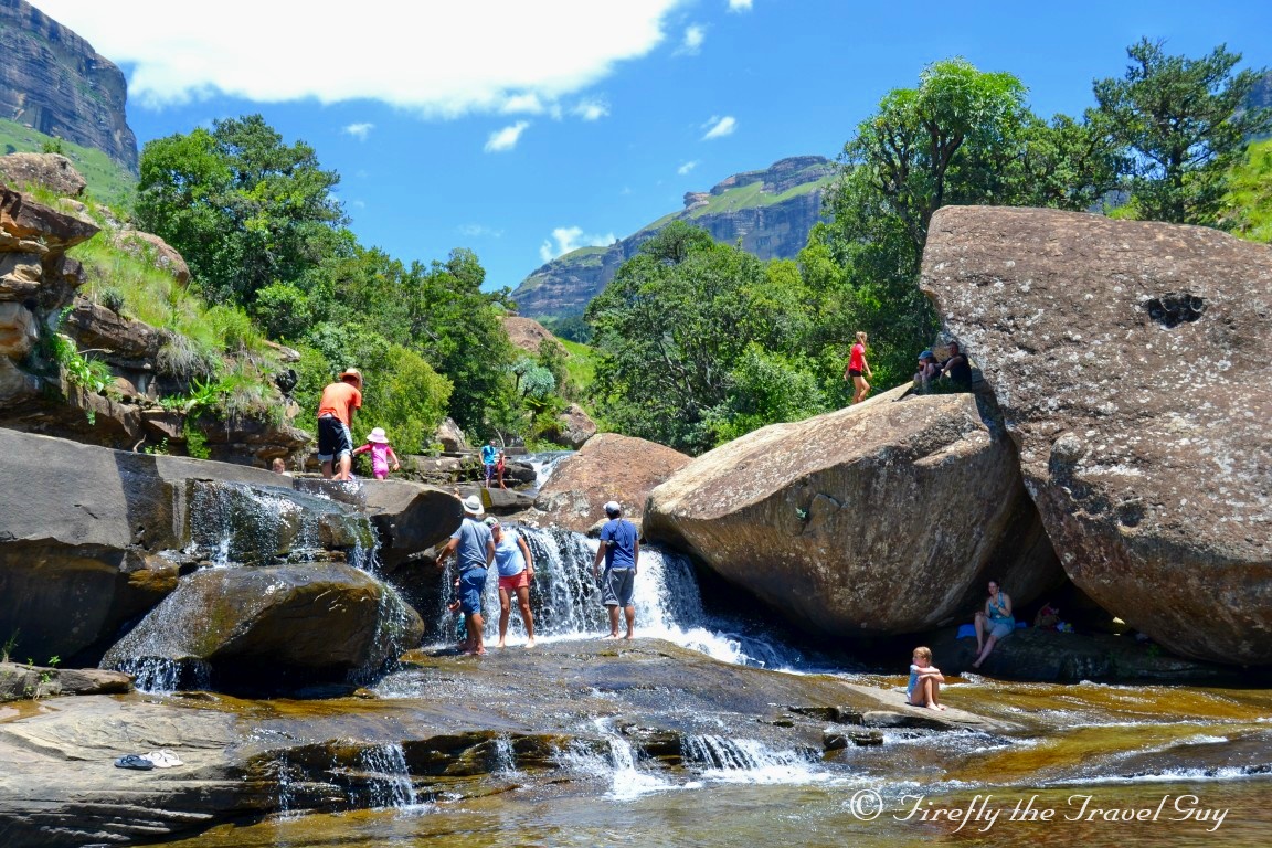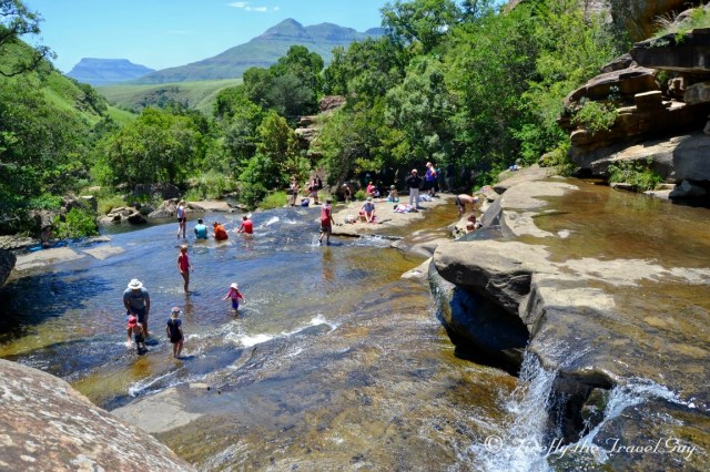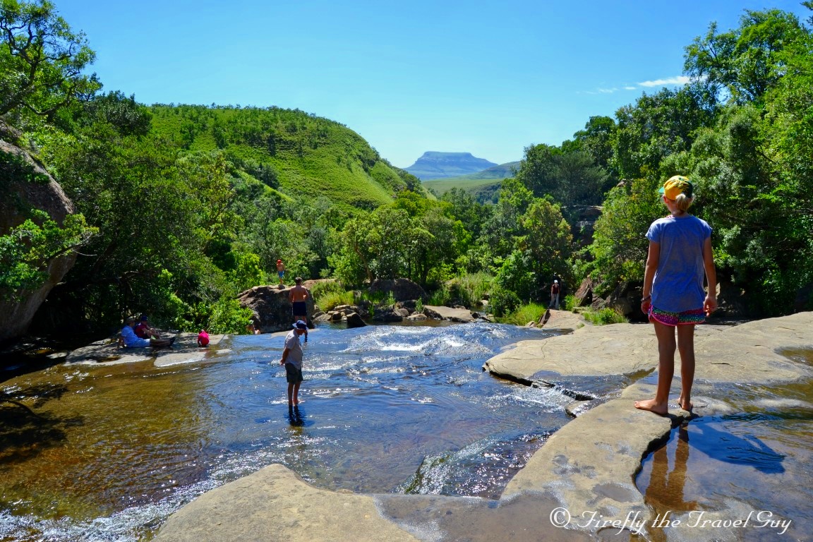 When you arrive at Mahai campsite in the Royal Natal National Park in the Drakensberg, one of the first things you notice is that there is no swimming pool. “What! No swimming pool? How is one supposed to cool down on those hot barmy summers days while camping?” you ask. Mahai doesn’t have a swimming pool for a purpose. The campsite sits on the banks of the Mahai River and 15 minutes upstream along the Queen’s Causeway is where you head to the Cascades if you want to cool down. The Cascades is a series of cascading waterfalls and shallow areas offering bathers a safe spot to enjoy the crisp clean mountain water that flows out of the Berg. You may not be able to dive into deep pools or swim lengths but I didn’t hear one person complain during the ten days we were there. How often do us city folk get to swim in a mountain stream?