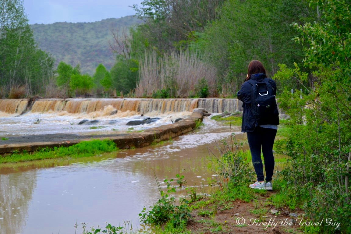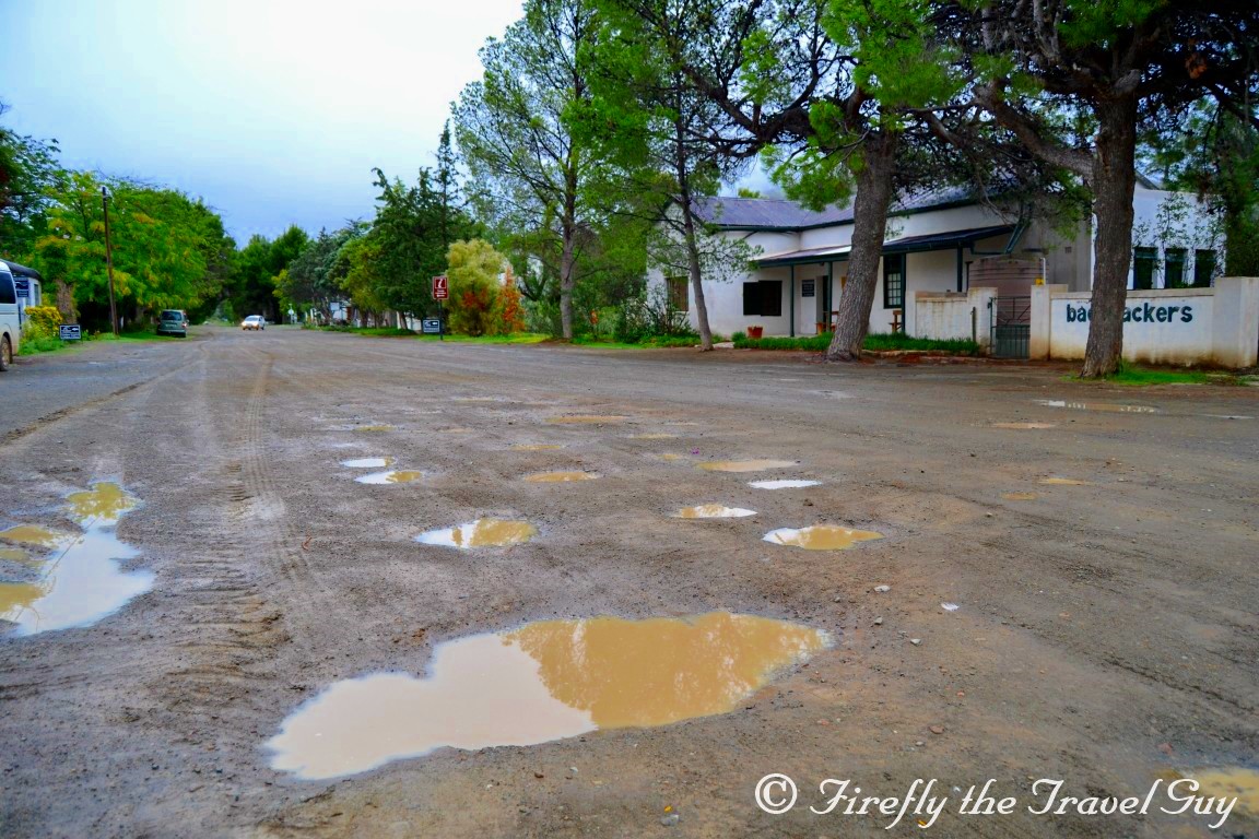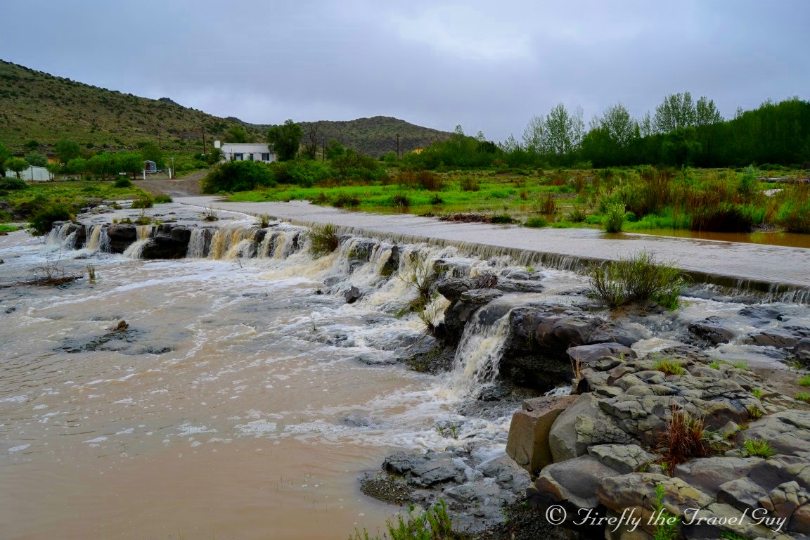 But puddles in the road wasn’t what drew the oohhhh’s and aaahhhh’s from us though. It was the Gats River that runs through the village. It wasn’t just running strong, it was running very high as well. So high in fact that it was over the low water bridge. Seeing all this water in this arid region totally made up for the fact that there wasn’t any sunshine and blue skies to take nice pictures, which was part of the mission for the two days we were in town for. Tourism meeting and nice pictures to use to promote Nieu-Bethesda and the Karoo Heartland.