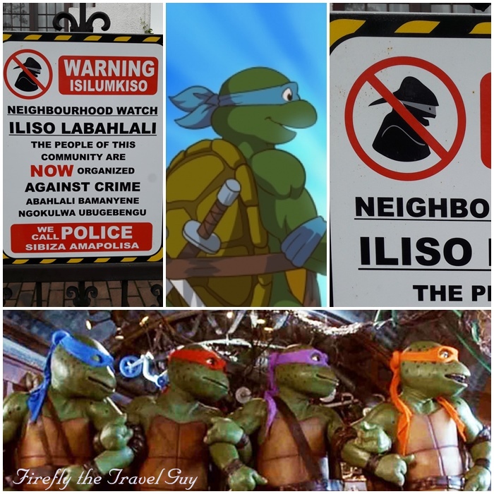 I was in East London a couple of weeks ago and noticed the neighbourhood watch board on the guesthouse gate. Neighbourhood watch groups do an amazing job getting residents together and curbing crime in residential areas and I live in a suburb with a very active neighbourhood watch. Looking at this board though I thought to myself that we’re very lucky in our area not to have a Ninja Turtle problem like they do in East London.