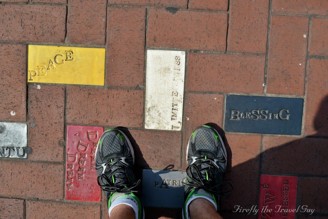 I think I’m going to take a little break from Campanile posts before people get tired of it.  I have a few more but will keep it back for a week or two.  Route 67 literally has 67 art pieces scattered along the way between the Donkin Reserve and Campanile.  Next to the bus station at the bottom of the steps down from Market Square, you will find the Walk of Words.  The pavement contains a whole host of words in different languages to represent the new South Africa and its prosperity as a democratic nation.  As trying to decide which ones to photograph and this was the shot.  PEACE and BLESSING.